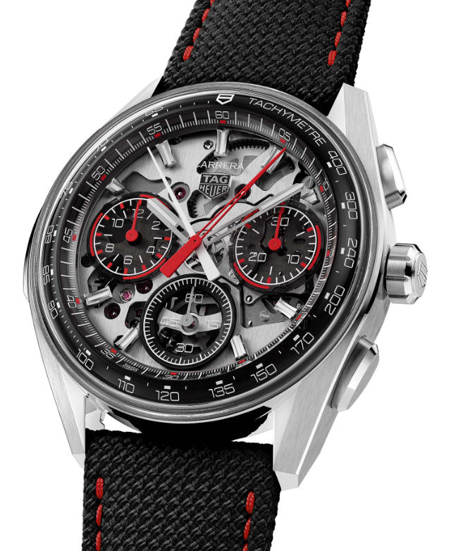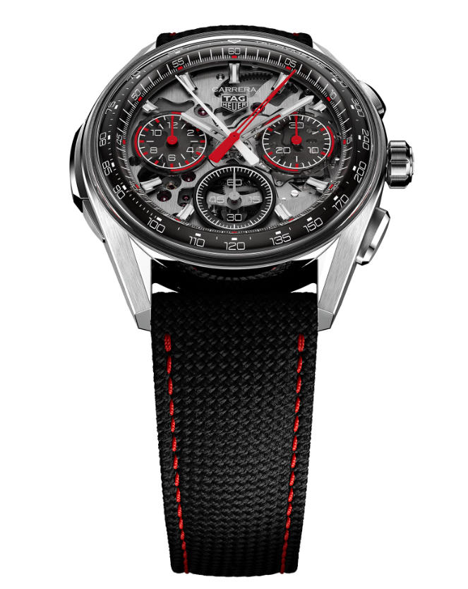 TAG Heuer powers the Carrera Split-Seconds Chronograph with the TH81-01 automatic rattrapante chronograph movement, developed in partnership with movement specialist Vaucher. This is the next iteration of the TH81-00 found inside the best clone TAG Heuer Monaco Split-Seconds Chronograph watches, but on paper, the updates seem to be largely cosmetic. The TH81-01 sports the same smooth 36,000 bph beat rate, the same generous 65-hour power reserve (dropping to 55 hours with the chronograph engaged), and the same party-piece split-seconds chronograph functionality (allowing wearers to stop one of its twin chronograph seconds hands for a reading one while the other continues to run, before “catching up” at the press of a pusher). On the finishing side, though, the TH81-01’s skeletonization seems to be notably less extreme than its predecessor. Broader, less intricately cut-away bridges dominate the caseback view in photos, which gives more room for TAG Heuer to show off its meticulously hand-engraved checkered-flag finishing pattern. Extra luxe touches like hand-polished anglage and matching screws shine through here as well, but the overall finishing philosophy is still contemporary and sporty rather than the plush opulence often found at this price point. With that said, there’s still plenty of impressive detail on display here, including the hand-painted red-to-black gradient strip adorning the skeleton rotor. To complete the watch, TAG Heuer fits the Carrera Split-Seconds Chronograph with a sporty, yet surprisingly simple fabric-effect rubber strap in black with racy red accent stitching. A two-button shield-motif deployant clasp caps things off here.