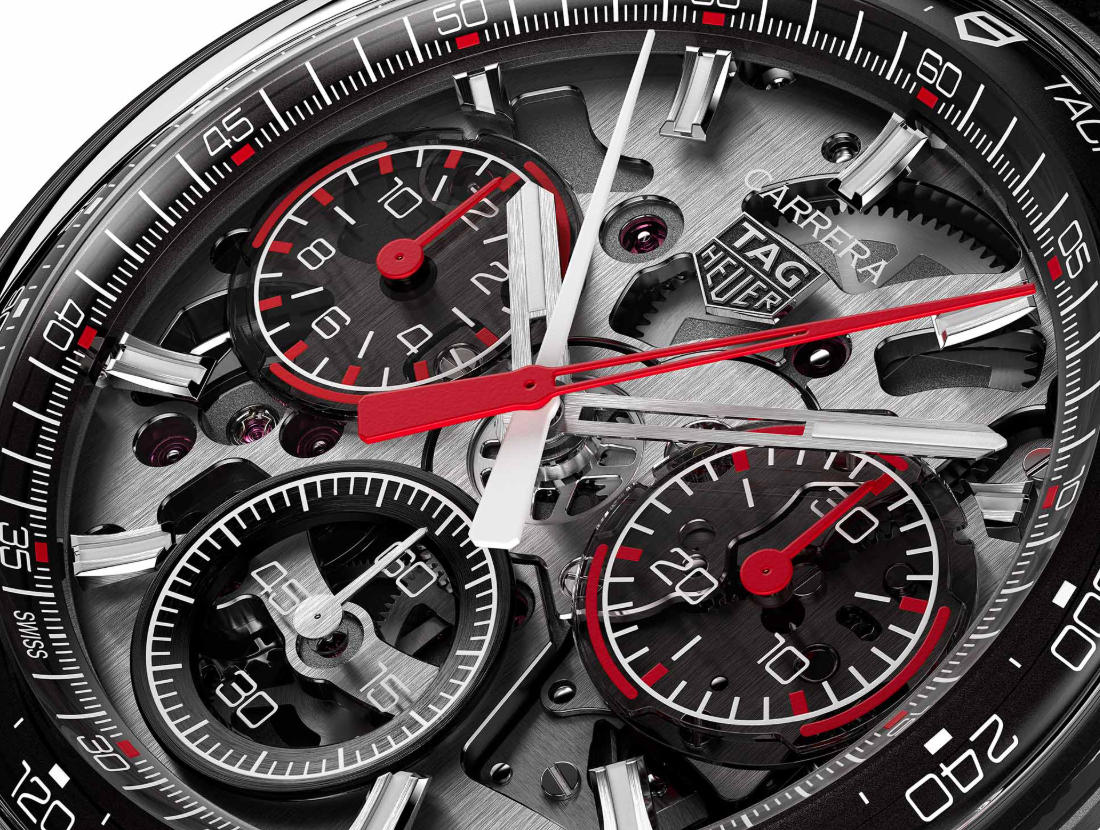 It’s difficult to call any full-skeleton rattrapante chronograph’s dial “subdued,” but when compared with the bombastic, architectural futurism of its Monaco cousin, the perfect copy TAG Heuer Carrera Split-Seconds Chronograph watches is almost demure. Nearly all the Carrera dial hallmarks are preserved here, from the split applied indices (placed on a transparent sapphire dial base) to the three-register layout and the tall, wave-shaped, double-sided outer chapter ring. Dynamic red accent graphics on the chronograph subdials and a matching red main chronograph seconds hand help to liven up the look in photos, but by and large, this looks to be impressively subtle compared to most of this watch’s rivals. Of course, the real spectacle here comes courtesy of the thoughtfully skeletonized movement bridges below, with a sharp, contemporary mix of linear brushing, polished anglage, matte blasting, and multiple layers of visual depth on display in images. Overall, it’s a dial layout that strikes an admirable balance between legibility, drama, and actual wearability, particularly for the rarefied market segment it sits in.