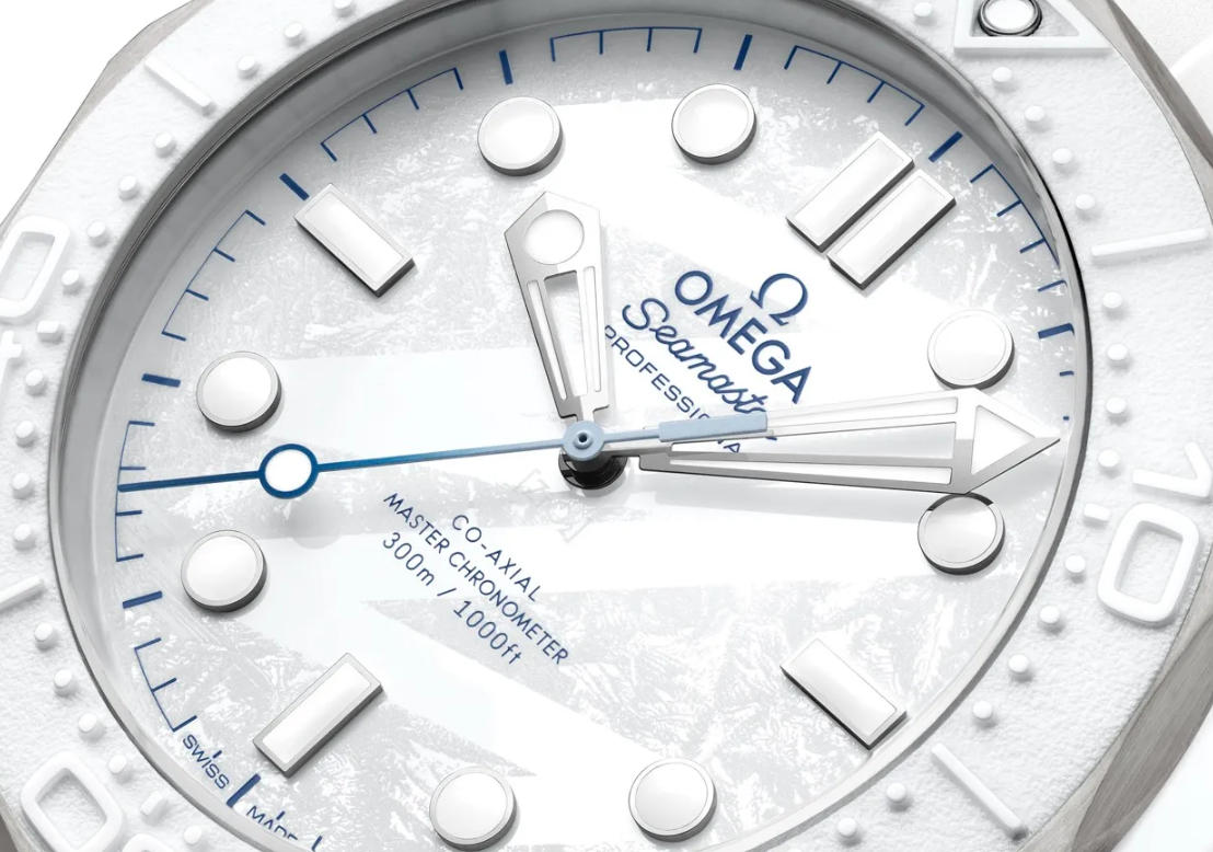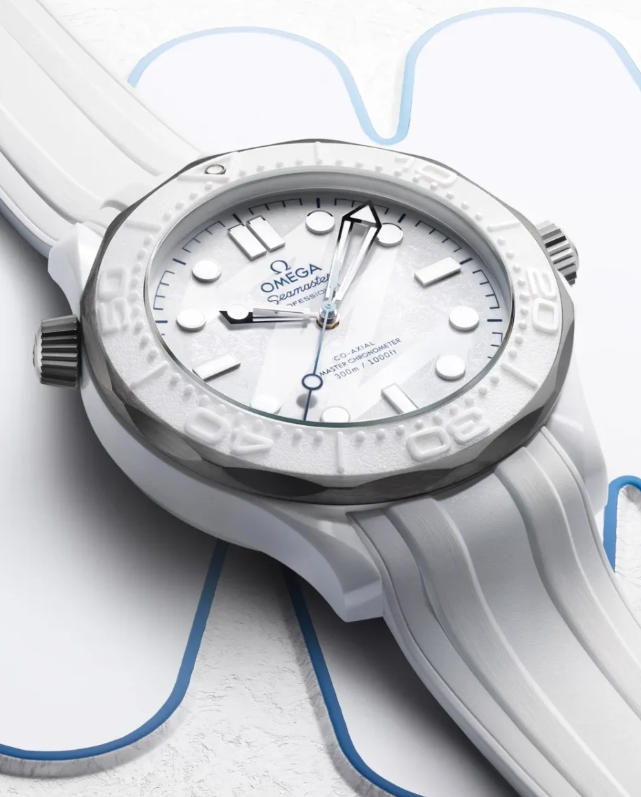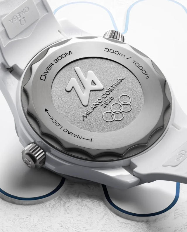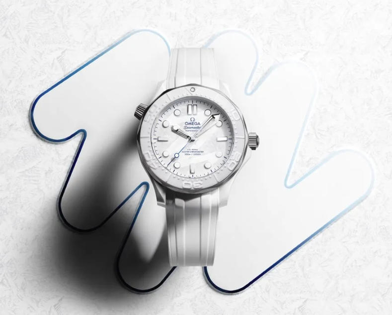 That seasonal elegance carries through to the construction. The polished-brushed case is crafted from white ceramic and grade 5 titanium, striking a balance between refined design and athletic durability. A uni-directional rotating bezel frames the dial, set with a white ceramic ring and laser-engraved diving scale in positive relief—materials chosen to deliver both lightweight strength and a clean finish worthy of an Olympic keepsake.
